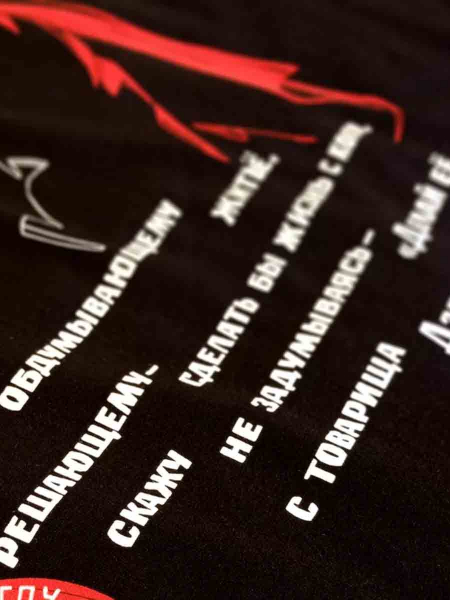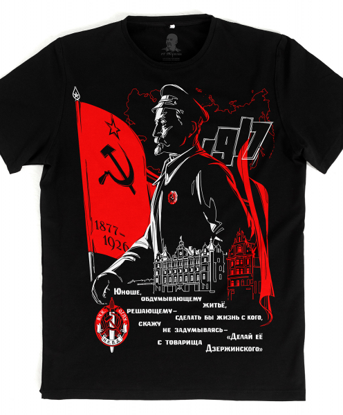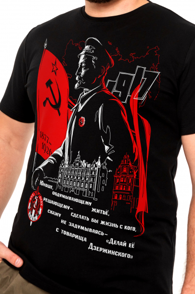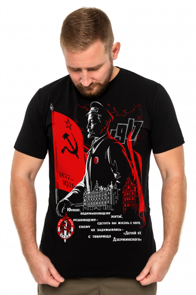 Универсальная чёрная футболка с авторской иллюстрацией Феликса Дзержинского — первого руководителя ВЧК.