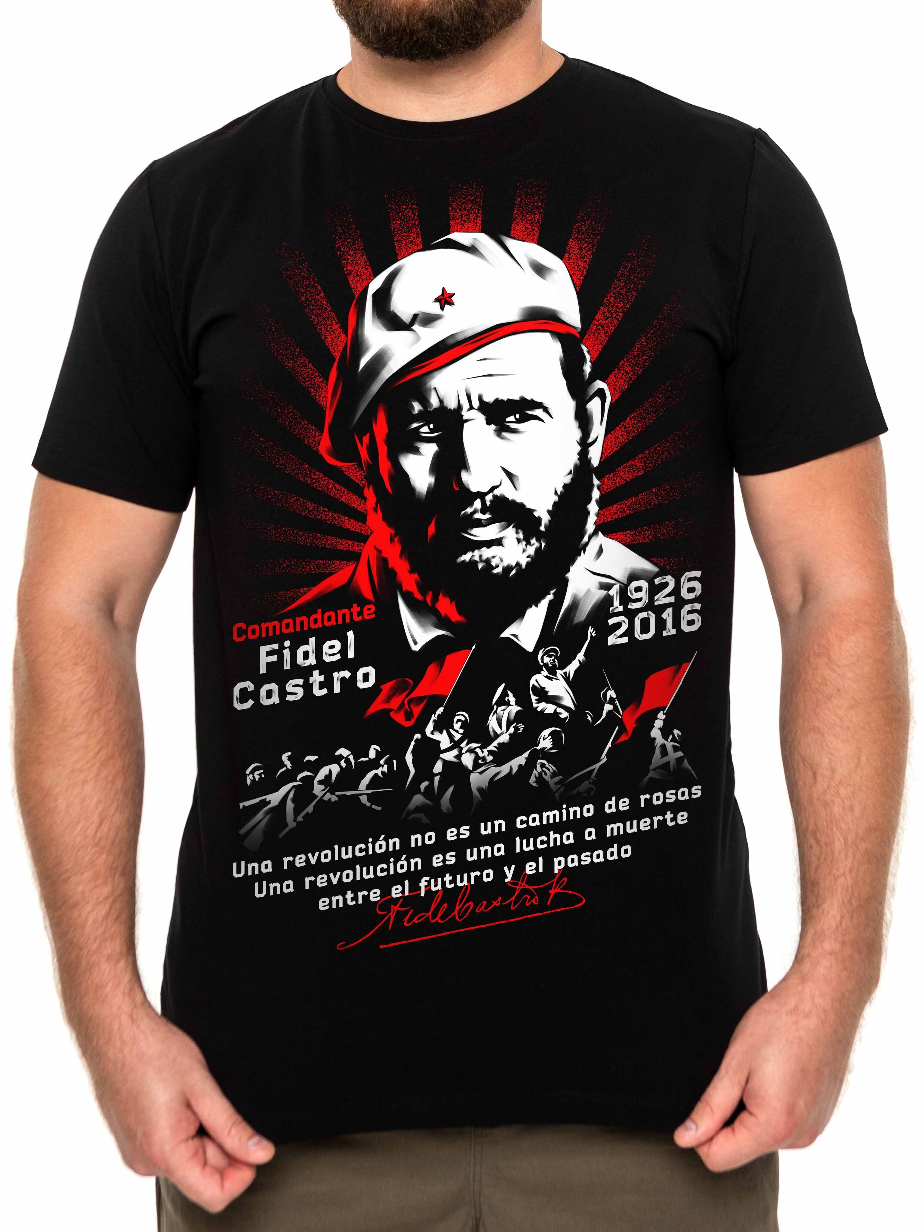 Футболка Хук с авторской иллюстрацией Фиделя Кастро. Фидель Алехандро Кастро Рус (1926—2016) — кубинский революционер, государственный, политический и партийный деятель, руководивший Кубой с 1959 до 2008 года. На футболке изображён крупный портрет лидера Кубинской революции, под ним группа революционно настроенных товарищей с красными стягами. В нижней части цитата на испанском: «Революция — не дорога из роз. Революция — это борьба на смерть между будущим и прошлым» и автограф Команданте.